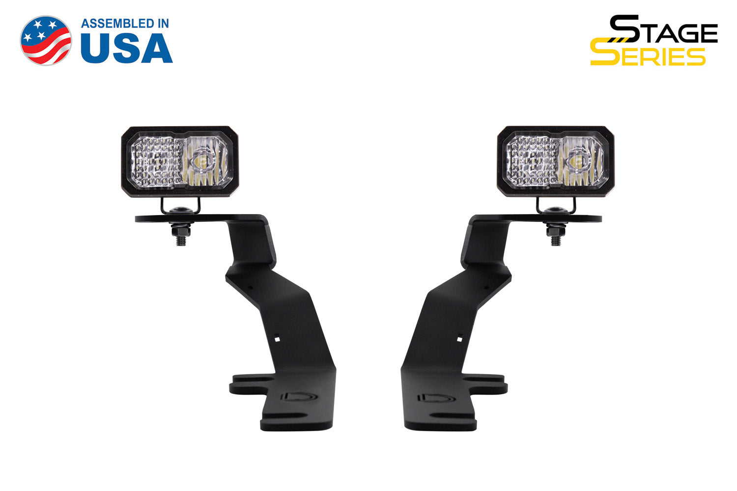 Perfect fitment. The Stage Series LED Ditch Light Kit for the 2015-2020 Ford F-150 allows you to easily mount two SS3 or SSC2 Pods above the hood. These application-specific brackets were CAD-designed to install using factory mounting points. No cutting or drilling required! This kit features a low profile design while minimizing glare, and will not interfere with raising or lowering the hood. Built to last. The brackets in this kit are constructed out of thick-gauge stainless steel. Unlike other options made out of mild steel, these brackets are full stainless steel and won't corrode over time. With their thick-gauge construction, you also won't experience any vibration or bouncing while driving. Focused. Traditional optics like reflectors or simple lenses lose light internally and to glare, so not all of the light shines on target. Instead, the custom-engineered TIR optic in the SS3 and SSC2 collects all of the light from the LED, and directs it only where you need it, drastically reducing glare and improving total efficiency.From there, while other options on the market lose as much as 10% of the light output shining through an outer lens, the custom-molded TIR optic in the SS3 and SSC2 serves as both the optic and main lens for greater efficiency and light output. Thanks to this innovative feature, when coupled with high-intensity LED chips, the total intensity of the Stage Series Pod is much greater than other LED pods using basic optics or reflectors with a standard outer lens. Functional output. All Stage Series beam pattern options were designed with optical simulation model'g, to shape the output in a highly-functional beam pattern. No matter what your auxiliary lighting needs are, there is a Stage Series optic for you! Driving is designed to supplement your high beams, but it's great for general illumination as well. Rather than a traditional "spot" pattern, the Stage Series Driving pattern shines in an 18x8 degree spread, providing just enough width to fully illuminate the road ahead at high speeds. Combo combines both the Driving and Flood optics. It shines light downrange in a focused, rectangular 40x20 degree pattern. The combo lens features a flood optic on one side and a driving optic on the other. Legal. For states that require them, we also offer snap-on covers for your SS3 and SSC2 Pods. These covers are available in a variety of colors and keep your Stage Series Pod clean and protected from dirt, dust, or whatever else the road throws your way! White or Yellow. All Stage Series LED pods are available in a cool white or selective yellow color. The white is a 6000K color temperature, which is a true cool white output, and matches most factory LED lighting. The selective yellow is a 3000K color temperature, great for high contrast in poor weather or a distinctive look on the road. We also offer replacement lenses that allow you to change the color or optic of your SS3 or SSC2 Pods. Sport or Pro. Stage Series LED pods are available at two different power levels. Both options use high-intensity LED emitters, and TIR optics for unmatched focus and overall output. However, the Pro option is double the amount of total power. Click the Specifications tab to see more information. Backlight Functionality. All SSC2 Ditch Light Kits include a distinctive Amber backlight feature. The SSC2's backlight fully illuminates the TIR optic, providing a more unique and modern look than the small indicator LEDs found in other products. Proven Reliability. Stage Series LED lighting has been extensively tested for long-term operation from -40 to 185 degrees F, along with vibration, moisture intrusion, and corrosion testing. All of these tests are completed to SAE standards, just like factory components. They've also been put to the test on-road by racers and enthusiasts alike. Made In the USA: If you're a lighting enthusiast who only buys American; Diode Dynamics is a clear winner in that category. One of very few brands in the automotive lighting industry who designs, engineers, and proudly produces their products right here in St. Louis, MO. We've sold their products for many years and are confident you won't be let down in the performance or quality departments. There's no better place to buy Diode Dynamics lighting upgrades for your car or truck.